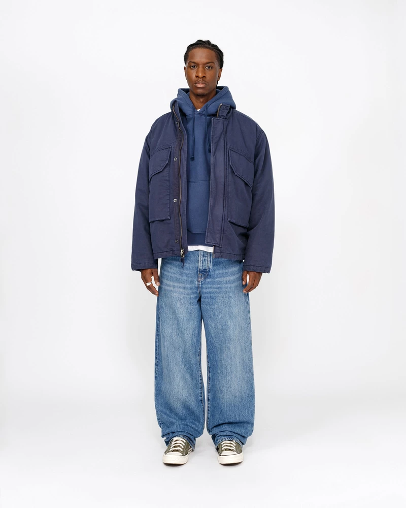 relaxed jean in 14.5oz cotton denim. regular waist with a relaxed rise and roomy straight cut through to the cuff. features branded nickel shank hardware and a suede stüssy logo patch. fits true to size. - button fly - belt loops - five pocket styling - swirly “s” embroidered on pocket - relaxed fit - relaxed rise - wide straight cut - unisex - size 32 inseam: 31 ½" / 80cm - size 32 leg opening: 20" / 51cm - main material: 100% cotton - imported