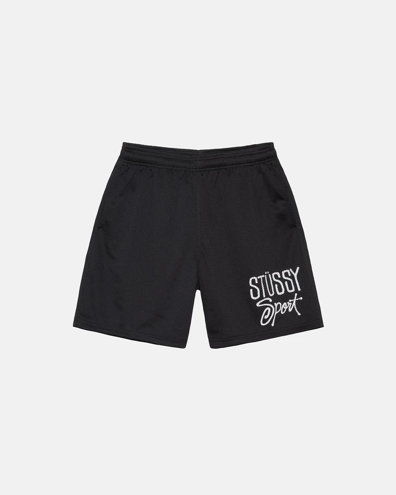 relaxed fit mesh short featuring an internal drawcord and elastic waist. stüssy sport logo printed on the left leg. - drawcord with plastic tips - side seam pockets - single rear welt pocket - double layer mesh - relaxed fit - unisex - size m inseam: 7" / 17.8cm - size m leg opening: 27" / 68.6cm - material: 100% polyester - imported