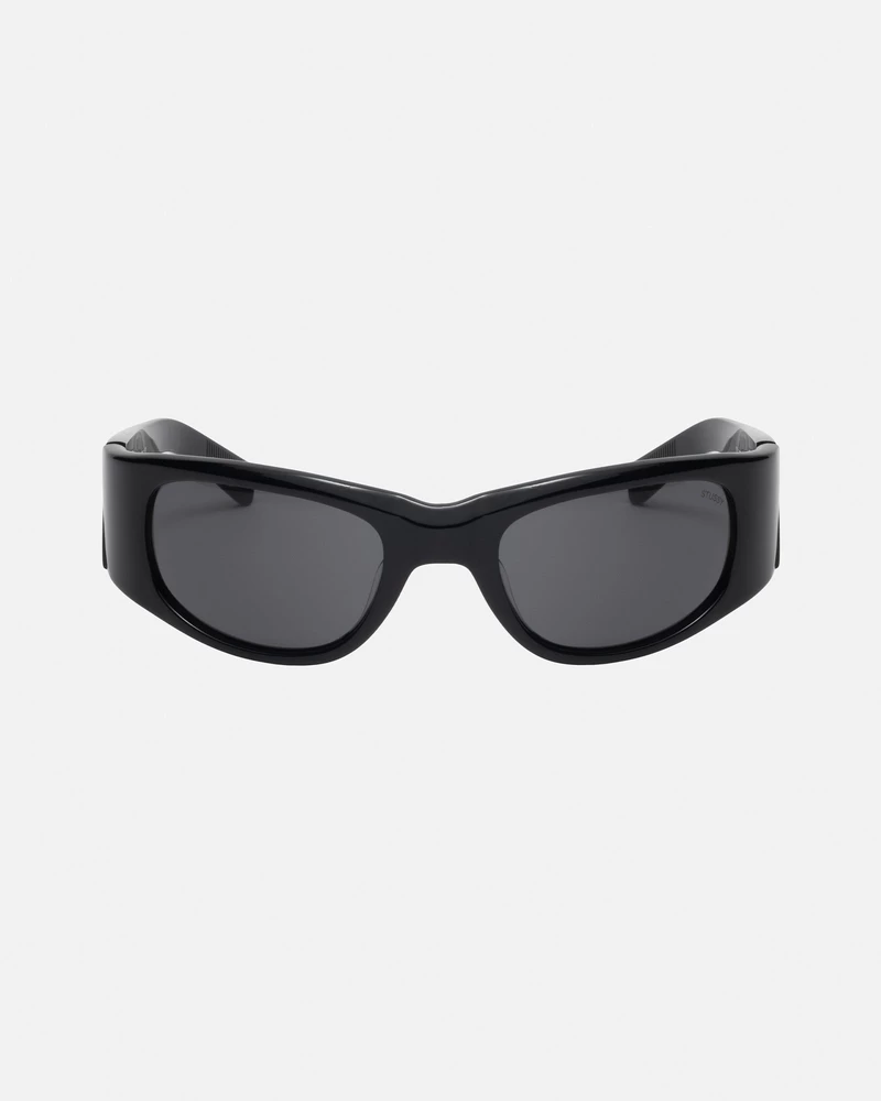 acetate sunglasses with a wrap-around shape and tinted lenses. stüssy smooth stock logo at the outside temple and eyegear logo inside. - 100% uva/uvb protection - five barrel hinges - shiny silver metallic hardware - smooth stock logo at outside temple - stüssy laser engraving on the lens - unisex - frame width: 5.8" / 148mm - main material: 100% acetate - includes case and cleaning cloth